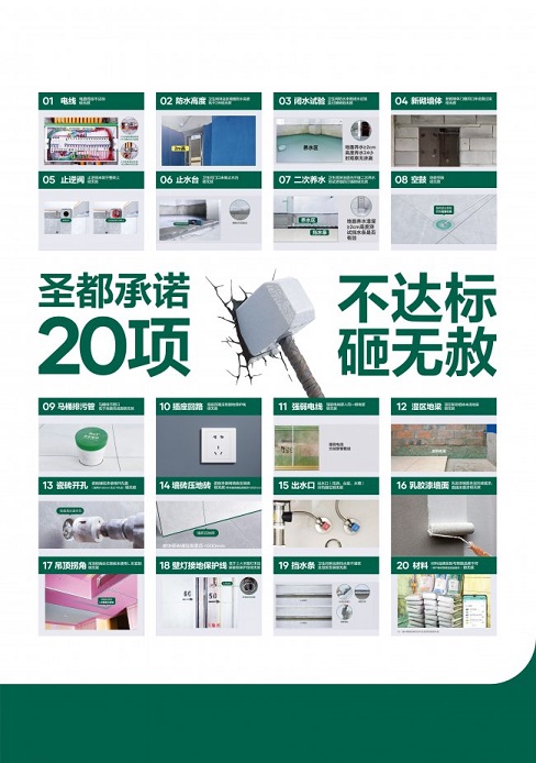 此外,上海圣都更是自加压力,向客户提出“施工20项不达标,砸无赦”标语,旨正在将质量精工落实到每一个工地,让客户选择圣都。